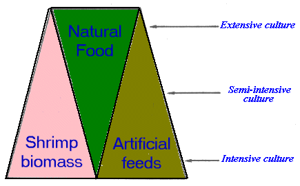 When the natural food is abundant, the demand for artificial feeds is considerably less. This is observed when the crop biomass is still small, such as during the initial weeks in high density culture or during the first one or two months in low density culture (Cruz, 1991). Strictly speaking, the primary productivity of a pond has no direct effect on actual feeding rates. The feeding rates remain unchanged although the computed feeding level based on the demand may appear to drop as a result of natural food consumption. In general, feeding rates when based on demand increases with smaller pond sizes and higher stocking densities (Cruz, 1991). |