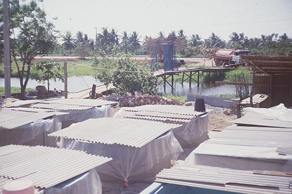Storage of concentrated seawater (delivered by tanker in background) at inland backyard hatchery in Thailand